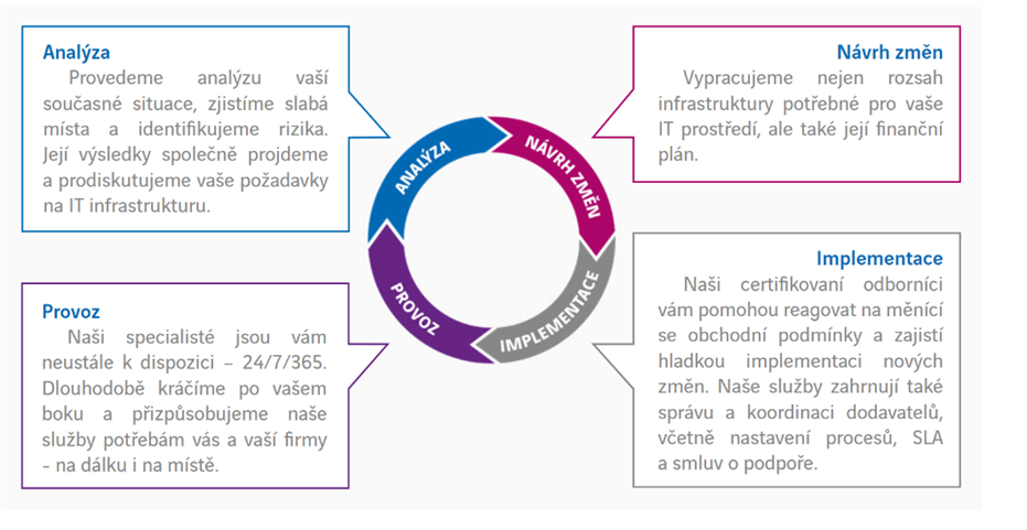 Dodáváme IT služby v oblasti hardwaru i softwaru – postaráme se o monitoring a bezpečnost vašeho IT prostředí včetně přístupové, pevné a mobilní sítě. Zajistíme kompletní nebo částečnou správu ICT a pomůžeme vám najít řešení, které sníží náklady na informační a komunikační technologie.