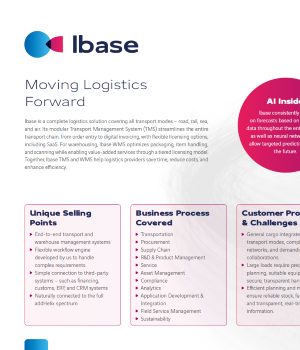 lbase je logistická softwarová platforma, která spojuje transportní management (TMS) a skladové hospodářství (WMS) do jednoho systému. Umožňuje digitálně řídit celý logistický řetězec – od přijetí zakázky přes plánování dopravy až po vyúčtování.