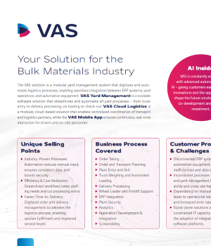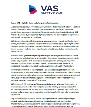 VAS (Vehicle & Access System) je softwarová platforma pro digitální řízení logistiky v průmyslových a logistických areálech. Centralizuje plánování příjezdů, pohyb vozidel i logistické operace a propojuje je s podnikovými systémy a infrastrukturou areálu. Výsledkem je vyšší efektivita yard managementu, kratší čekací doby a bezpečný, transparentní provoz logistických procesů.